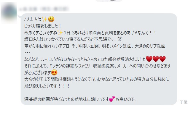 それに加えて、キッチンの詳細やファミリー収納の提案、メーカーへの問い合わせなどありがとうございます。
